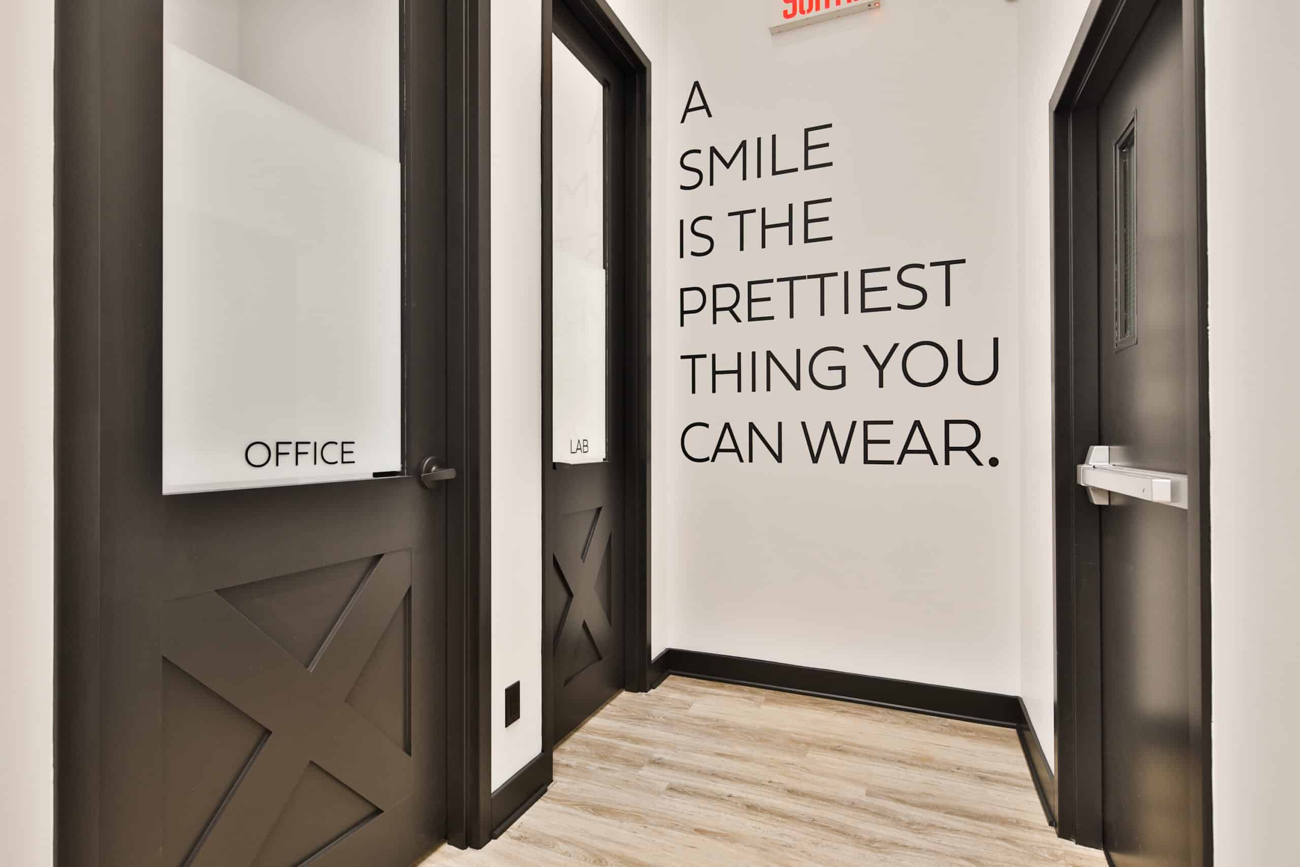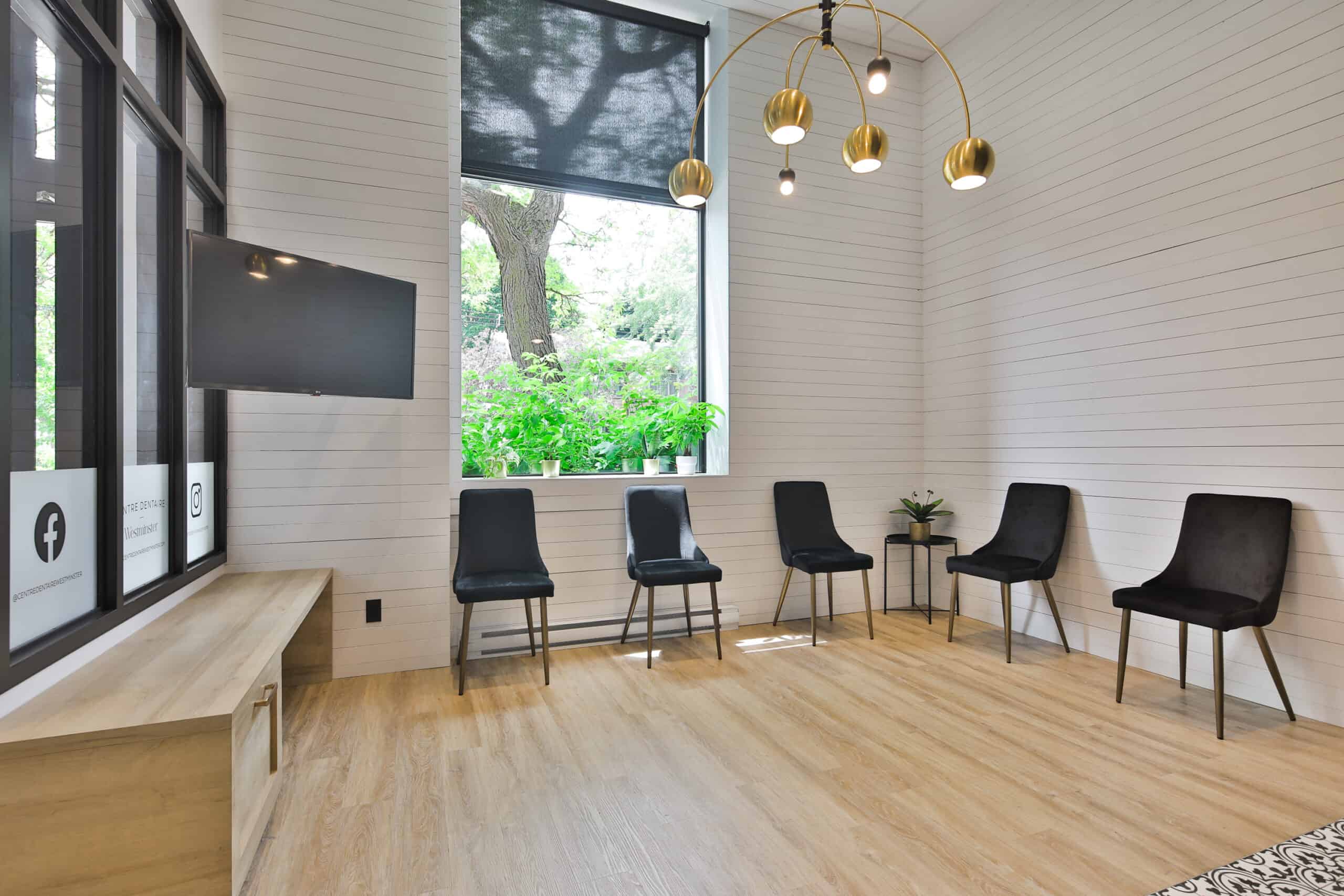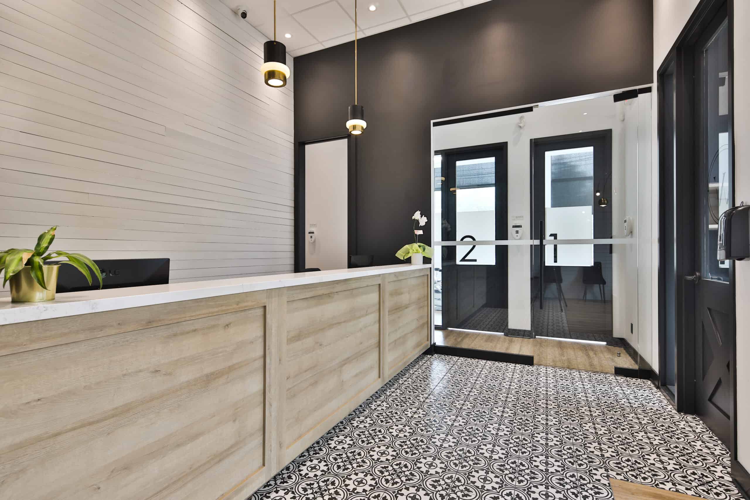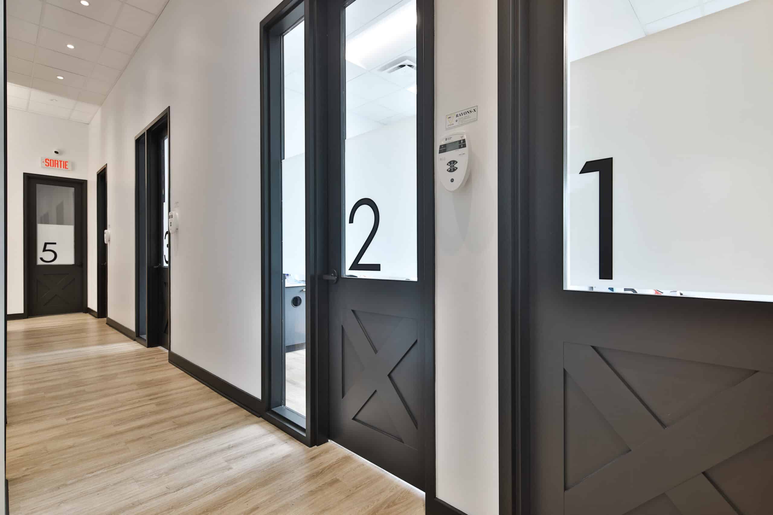 Les différentes couleurs ont été travaillées afin d’apporter un visuel intéressant aux différents éléments de la clinique : les lattes blanches aux murs et les portes à panneaux noirs apportent du caractère à l’espace.