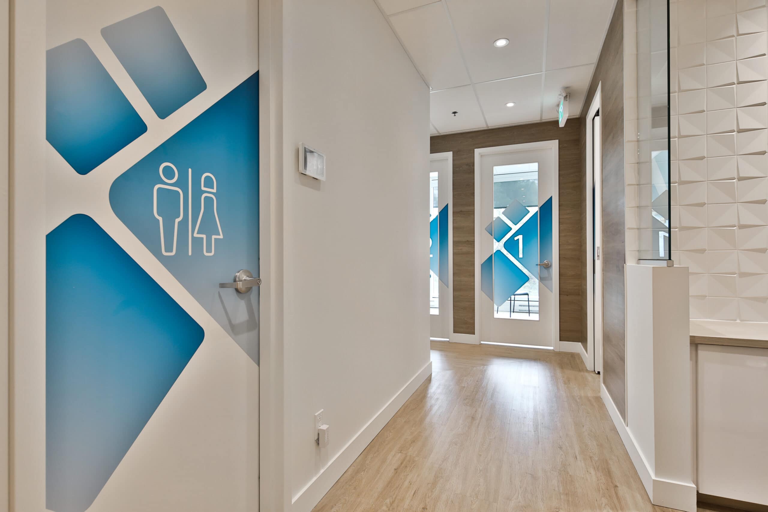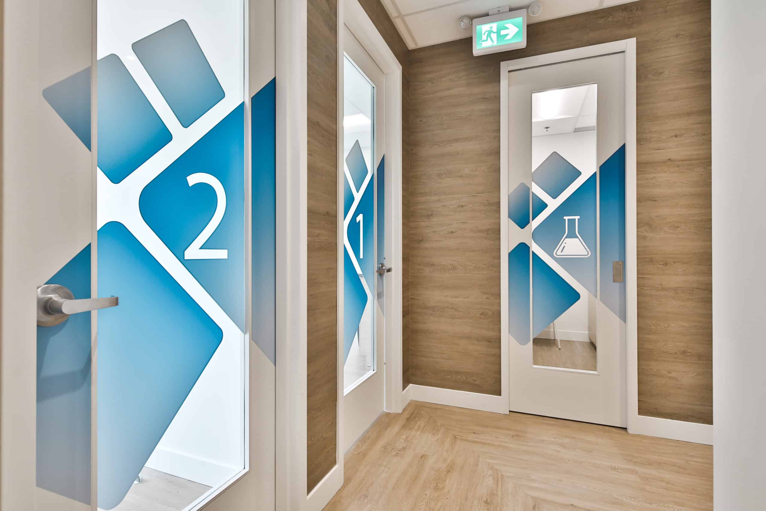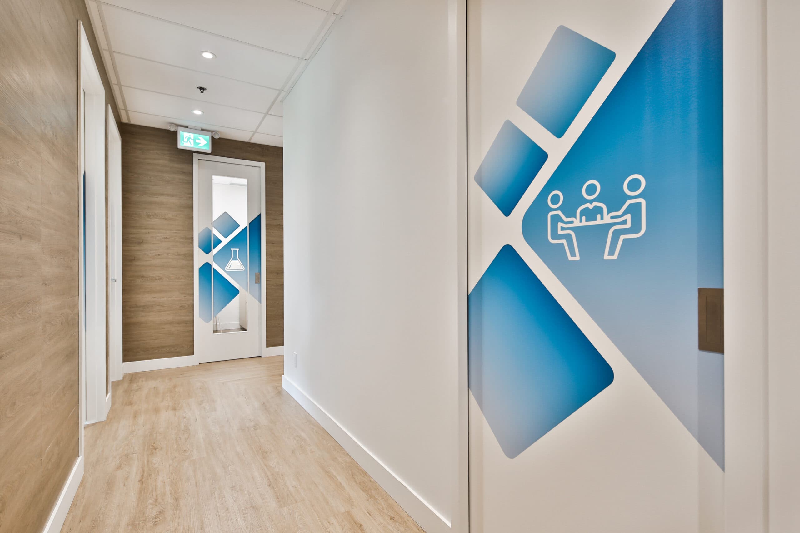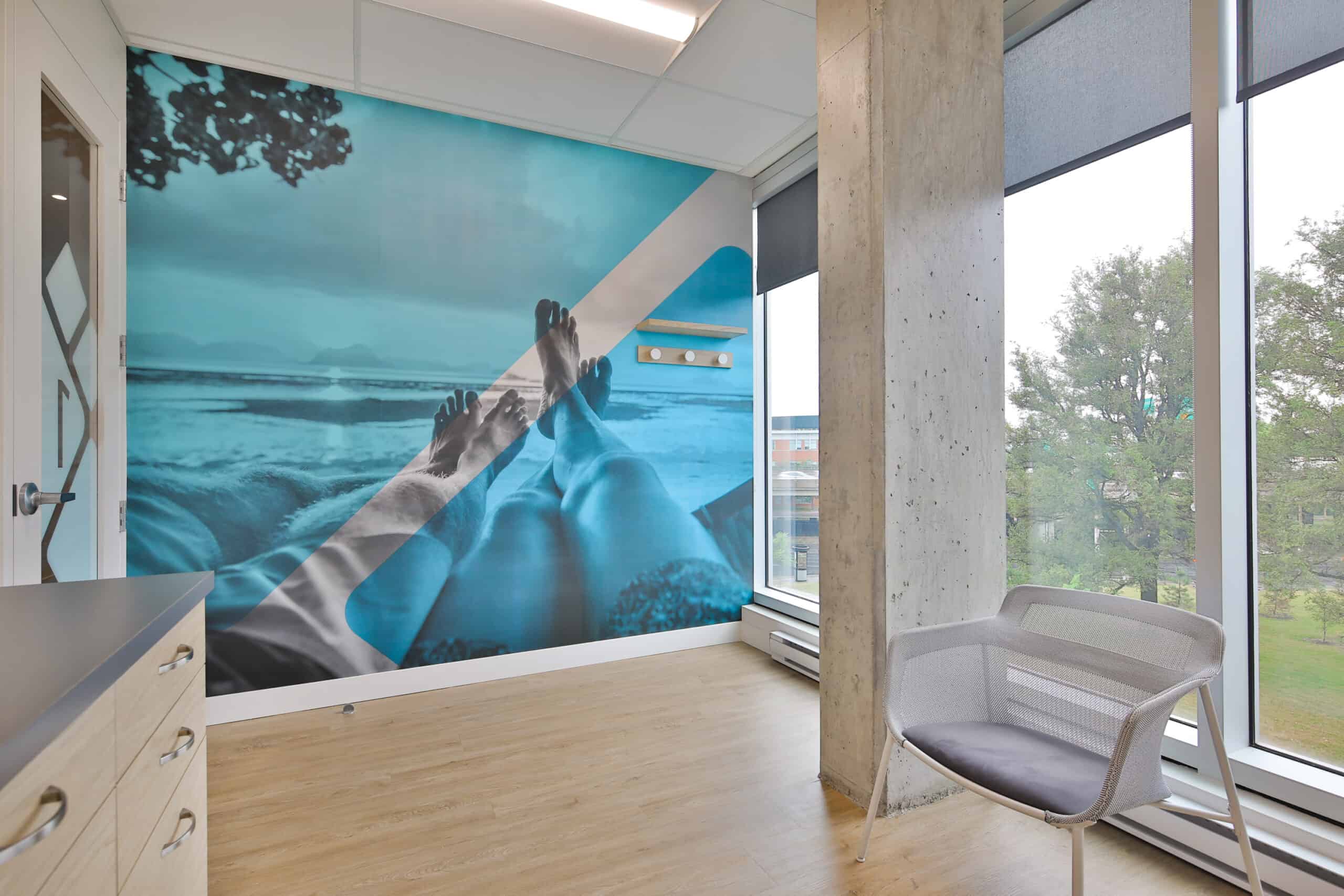 Des touches de bleu ont été ajoutées à l’ensemble afin d’imprégner l’espace de l’image de marque de la clinique.