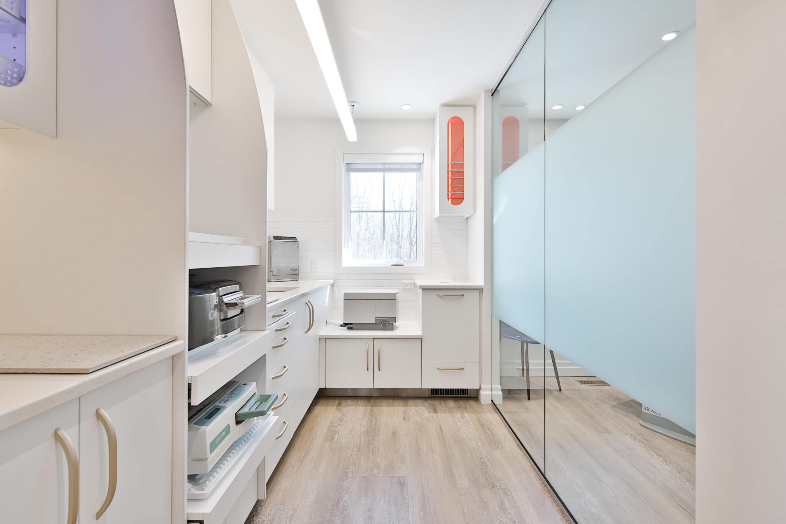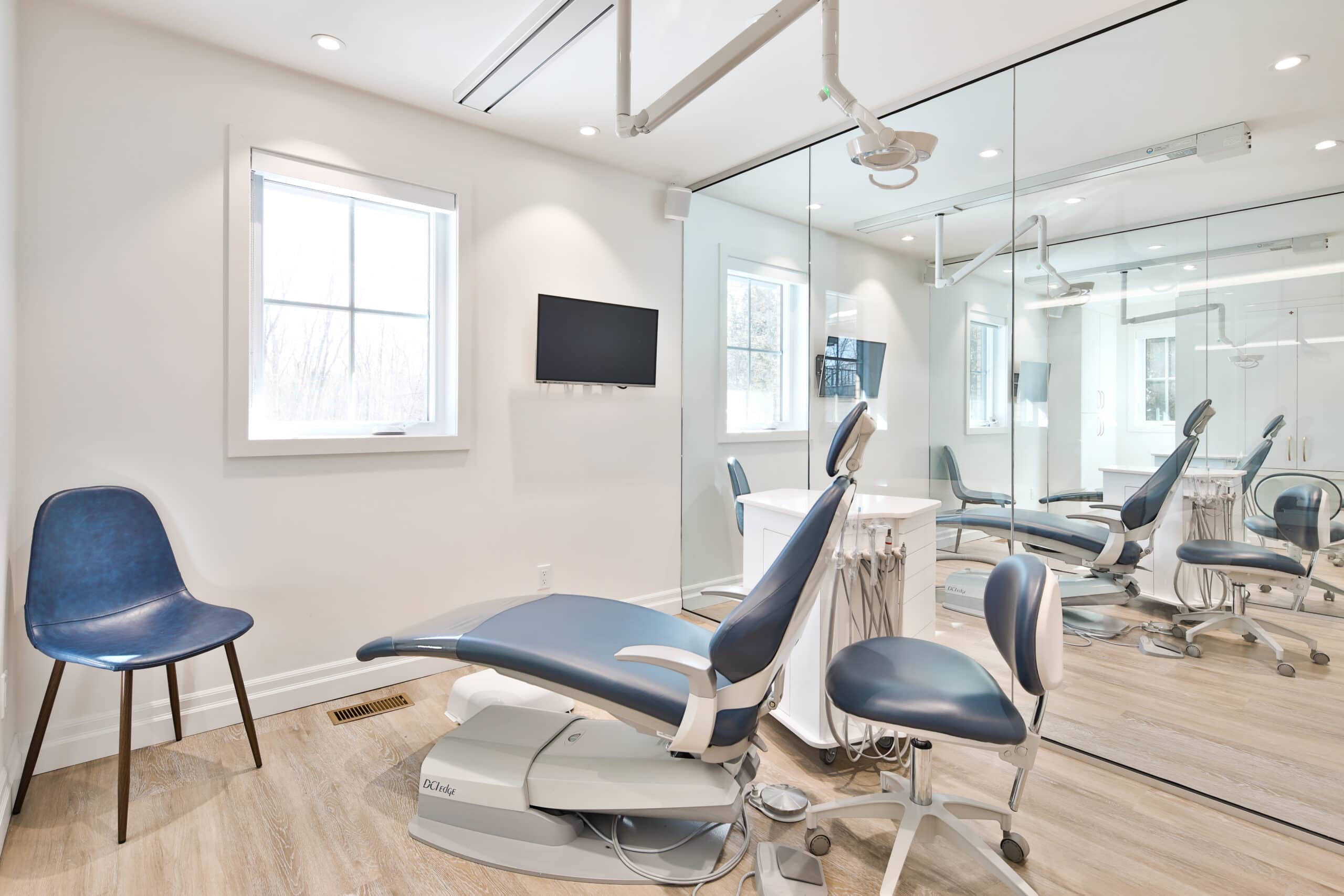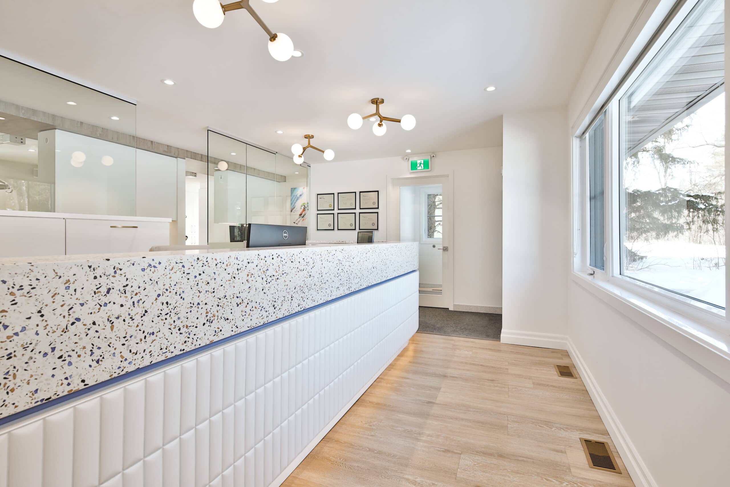 La clinique se situant dans un édifice aux allures résidentielles, le foyer a été conservé mais repensé comme faisant partie intégrante du design intérieur de la clinique d’orthodontie.