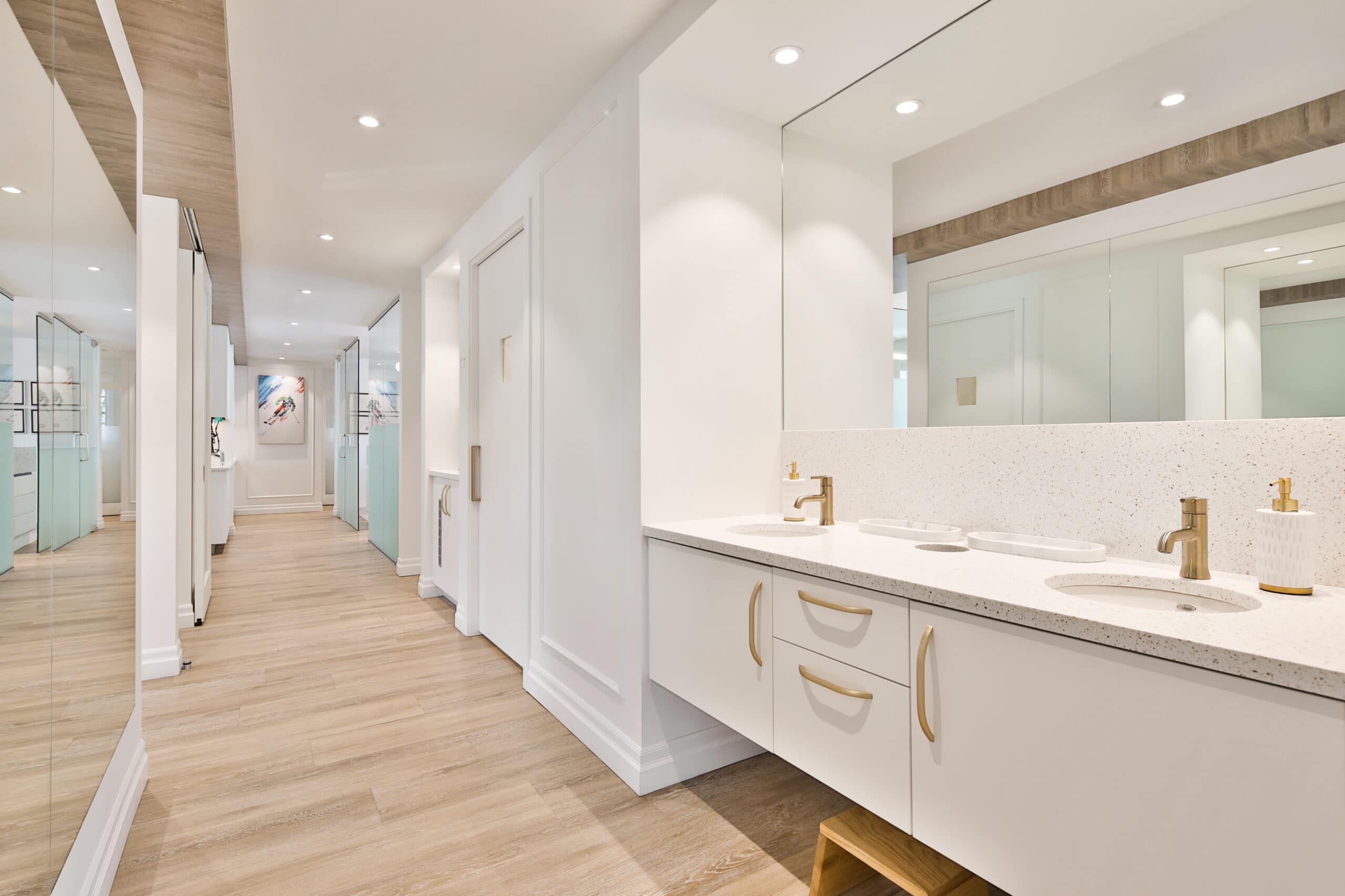 Pour ce faire, nous avons utilisé des miroirs et du vitrage pour agrandir l’espace, et du blanc pour le rendre plus lumineux.